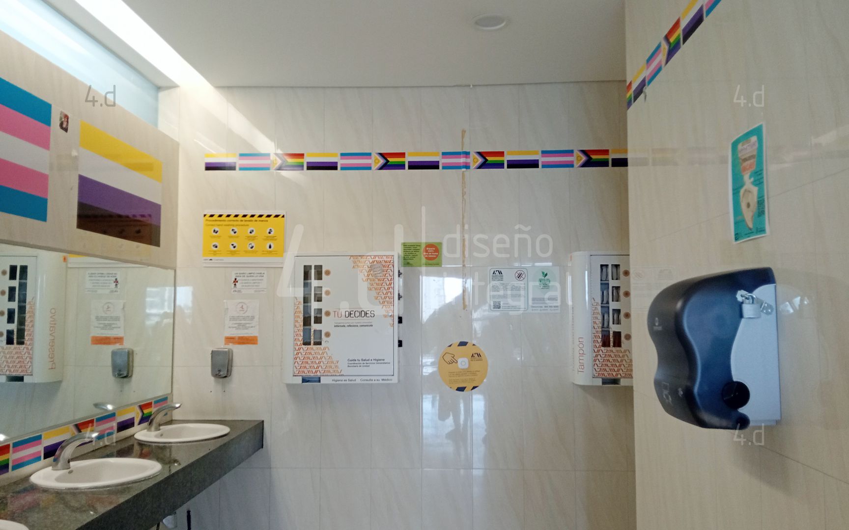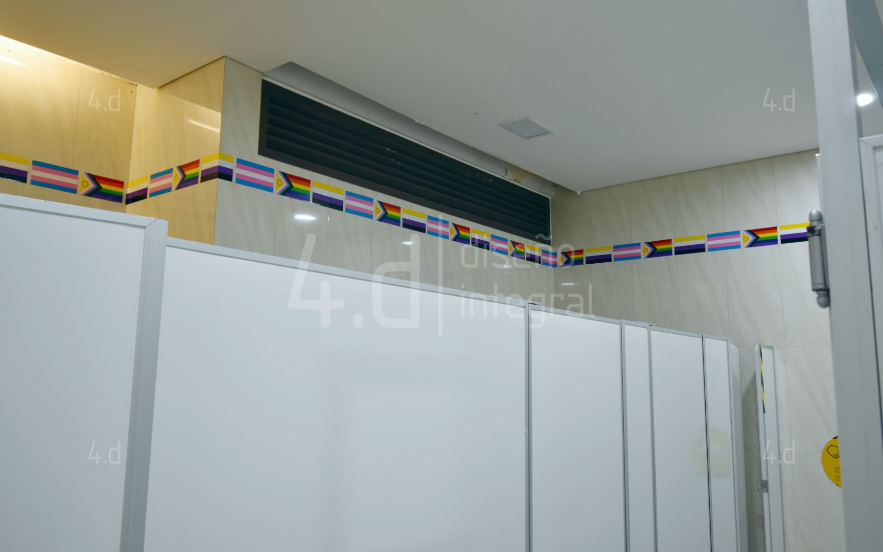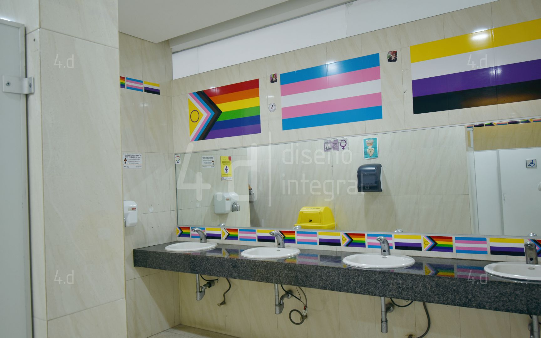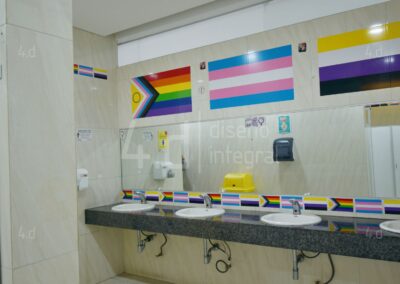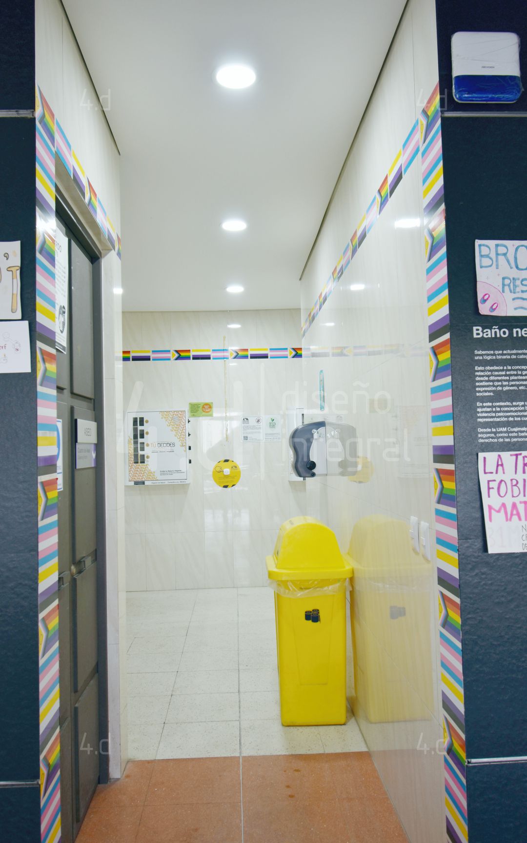 La intervención para un baño incluyente se centró en el uso del lenguaje gráfico como herramienta de comunicación, mediante calcomanías en vinil adhesivo, utilizando distintas banderas representativas de la comunidad LGBTQ+. Este recurso visual, además de aportar un carácter estético distintivo, permitió comunicar de forma clara el mensaje de inclusión, fortaleciendo el sentido de pertenencia y promoviendo una cultura de respeto dentro de la comunidad universitaria, respetando las dimensiones y condiciones existentes del espacio.