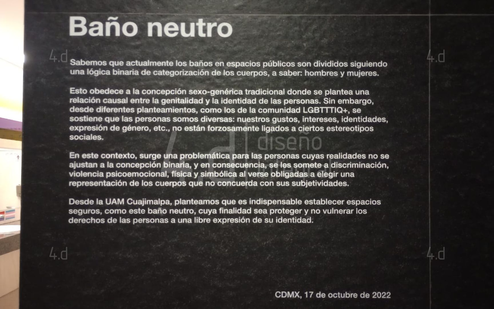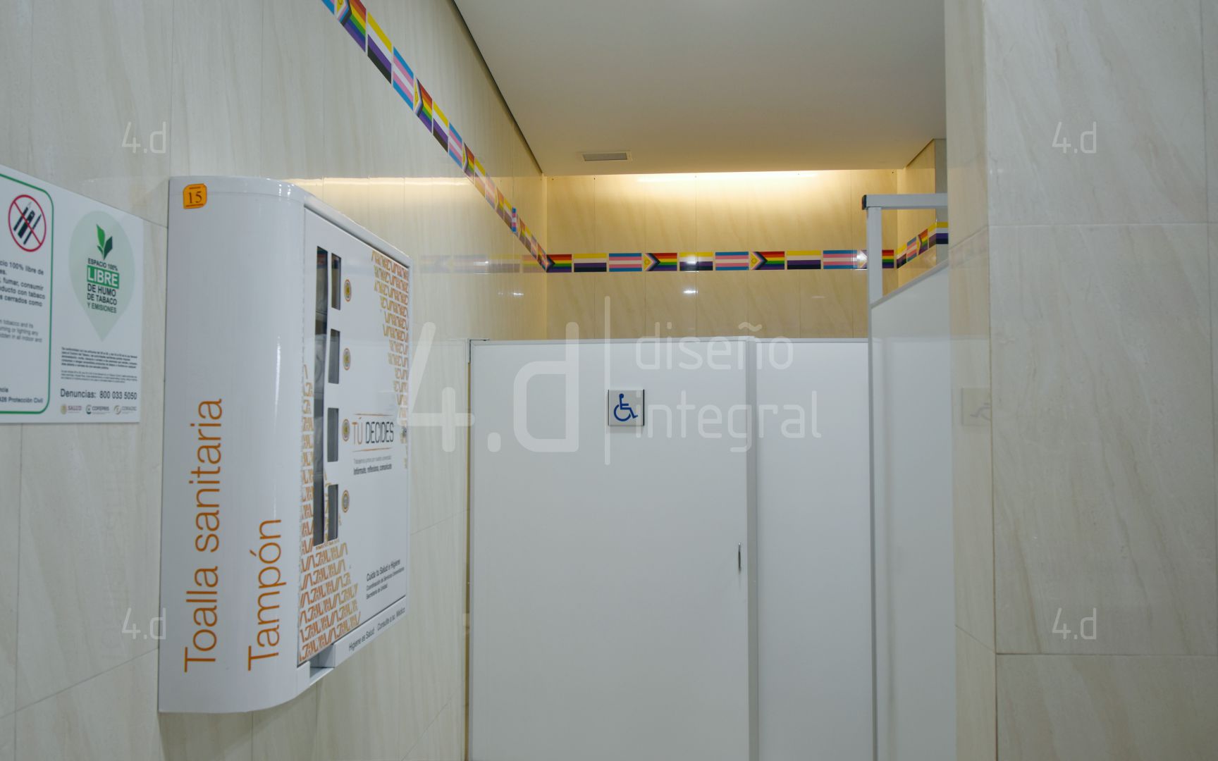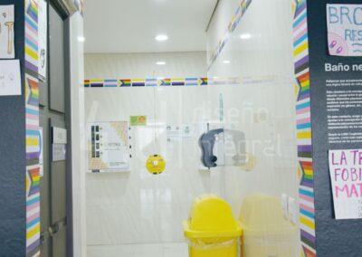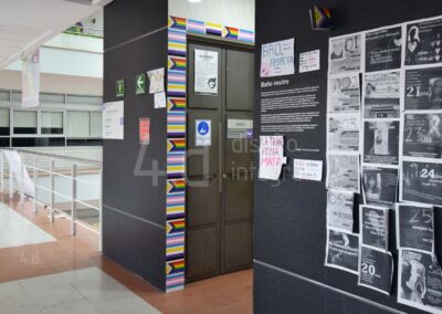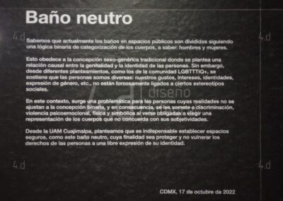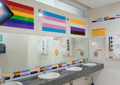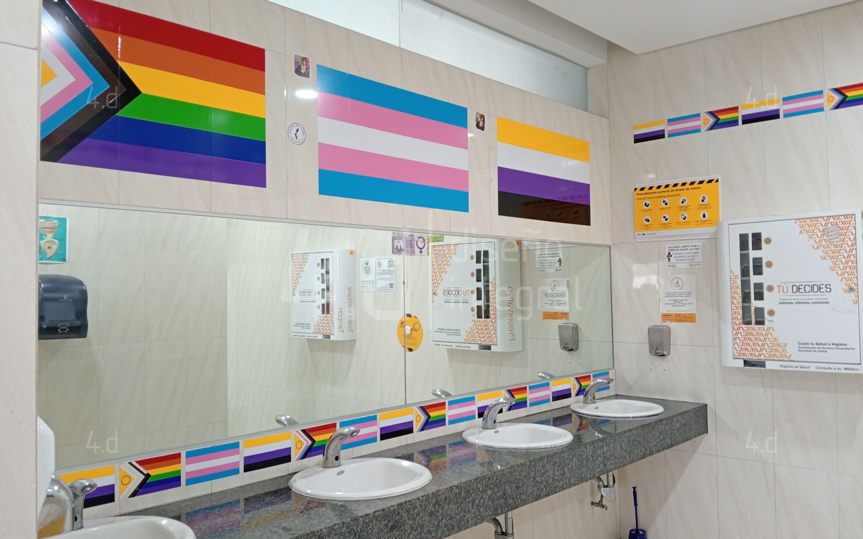 La intervención para un baño incluyente se centró en el uso del lenguaje gráfico como herramienta de comunicación, mediante calcomanías en vinil adhesivo, utilizando distintas banderas representativas de la comunidad LGBTQ+. Este recurso visual, además de aportar un carácter estético distintivo, permitió comunicar de forma clara el mensaje de inclusión, fortaleciendo el sentido de pertenencia y promoviendo una cultura de respeto dentro de la comunidad universitaria, respetando las dimensiones y condiciones existentes del espacio.