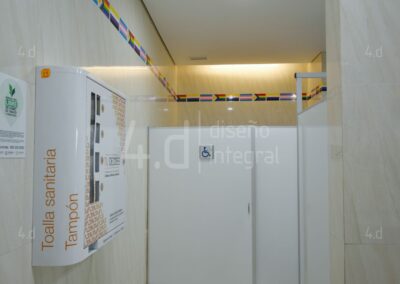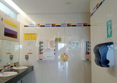 La disposición de los gráficos se planificó estratégicamente, cuidando la composición para maximizar su visibilidad e impacto sin interferir con la funcionalidad e infraestructura del espacio, de manera que el diseño se viera limpio y de alta legibilidad. También, se incorporó una impresión en serigrafía sobre el muro de acceso al baño, donde se presenta una explicación sobre la intención del proyecto.