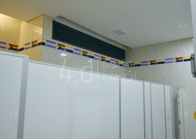 Para la ejecución del proyecto se realizaron cortes individuales de cada color de las banderas en vinil adhesivo, los cuales fueron ensamblados manualmente de acuerdo con la composición cromática correspondiente a cada una, este material de alta durabilidad y resistencia es adecuado para soportar la humedad y el uso constante del área.