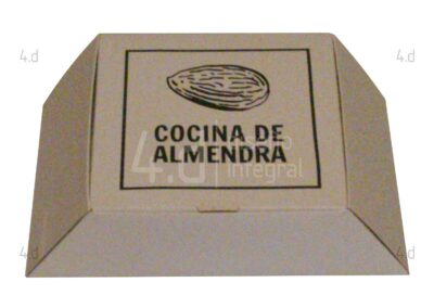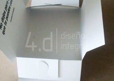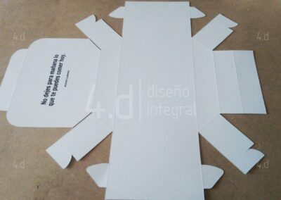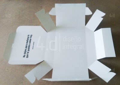 Se elaboró el suaje correspondiente y el proceso de suajado para obtener las piezas listas para el doblado y ensamble. La impresión se aplicó en serigrafía a una tinta, tanto en el interior como en el exterior del envase.
