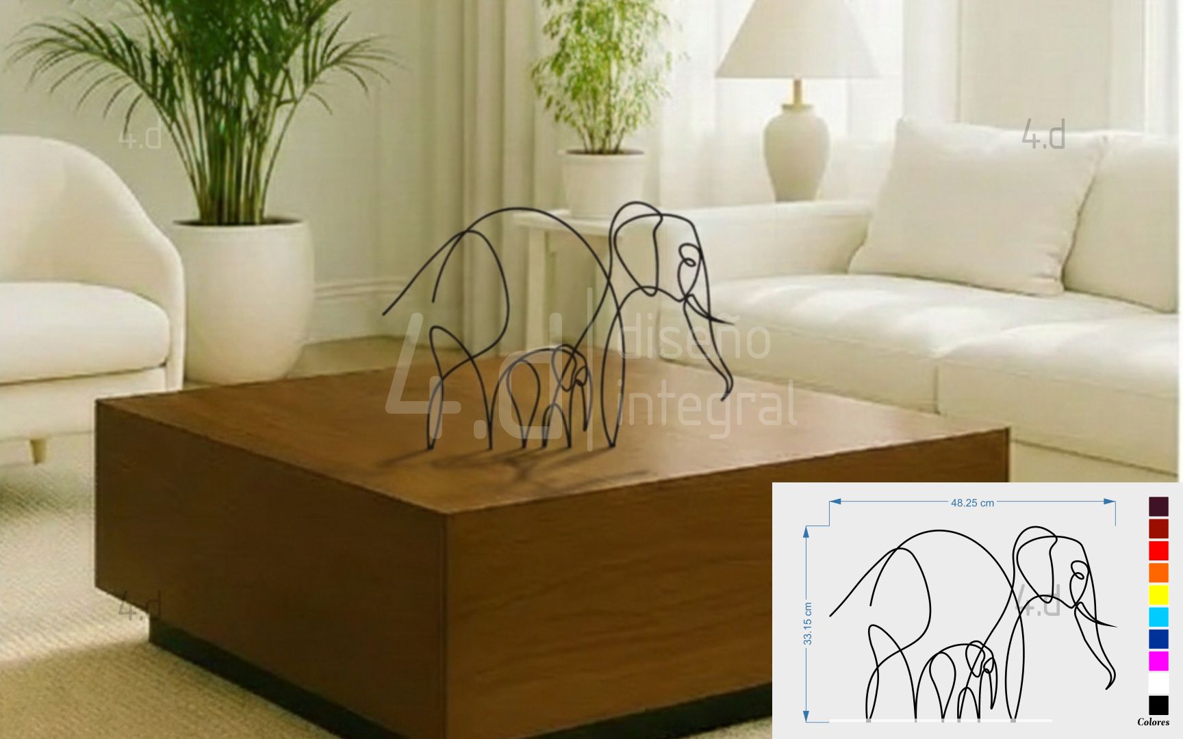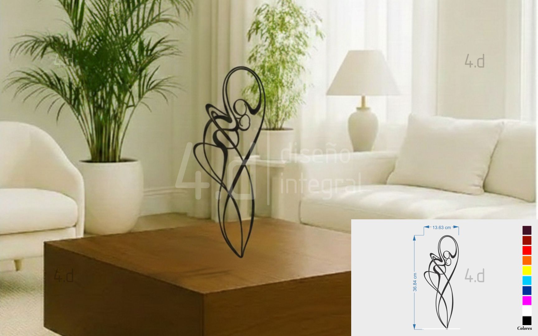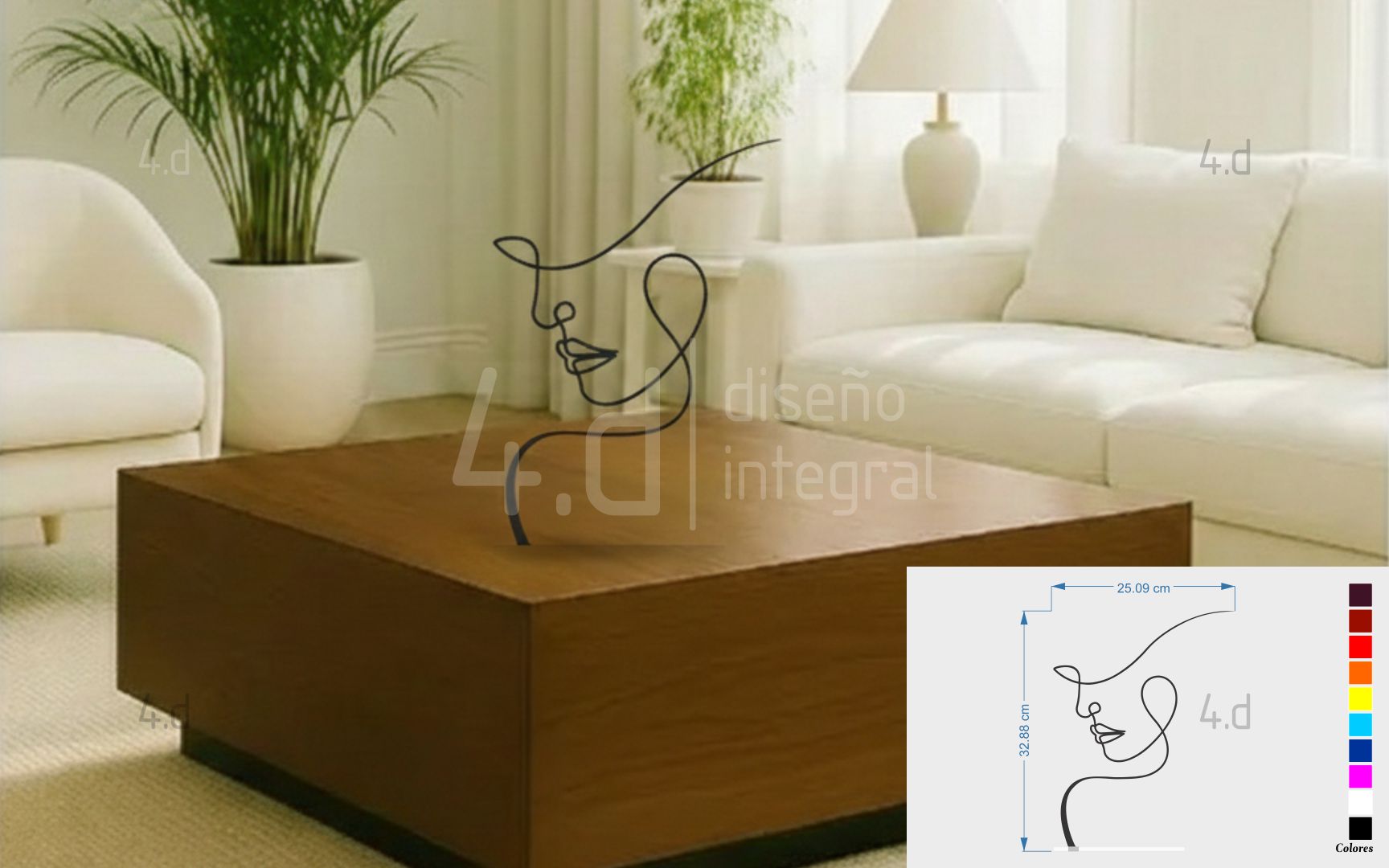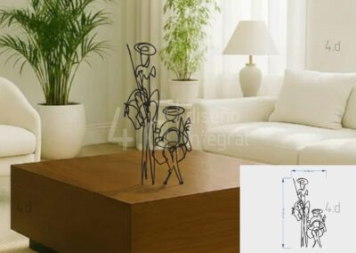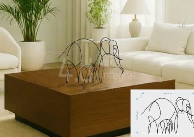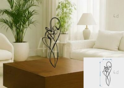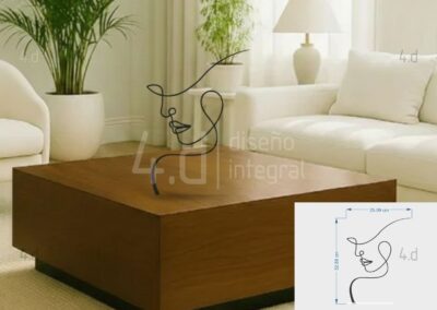 La pieza está fabricada en acrílico utilizando tecnología de corte láser, lo que garantiza precisión en los trazos y limpieza en los acabados. Su estructura lineal se apoya sobre una base del mismo material, diseñada para mantener la pieza firme y estable, conservando al mismo tiempo una apariencia ligera y sutil. Las propiedades del acrílico favorecen su adaptación a distintos ambientes, gracias a su capacidad de generar contrastes delicados con el entorno.