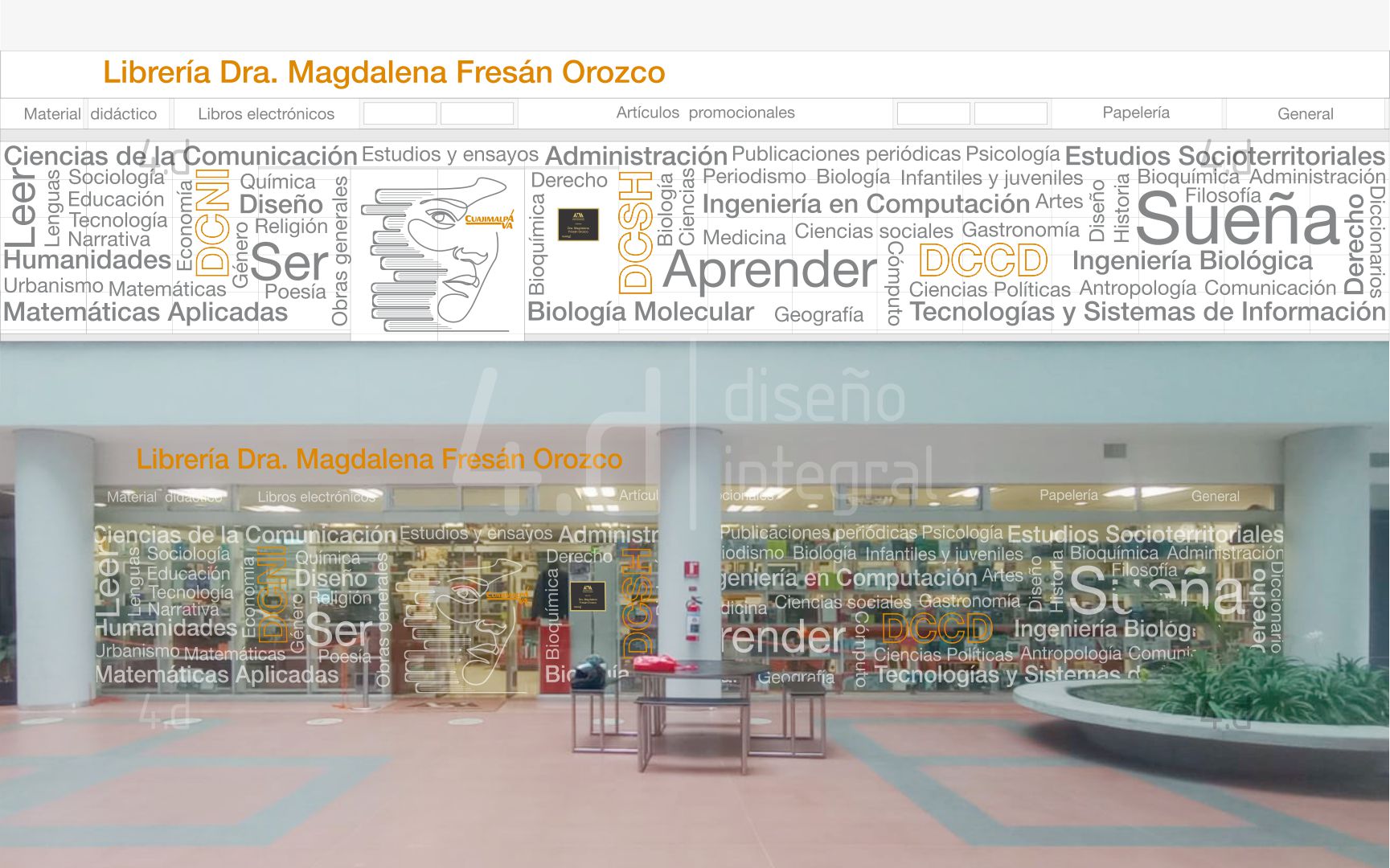 Objetivo: Conmemorar la trayectoria de la primera rectora de la UAM Cuajimalpa a través de un diseño visualmente atractivo que complementara el espacio de la librería sin obstruir la visibilidad de lo exhibido.