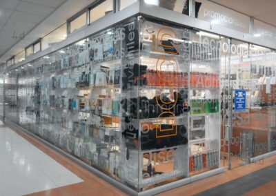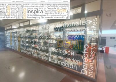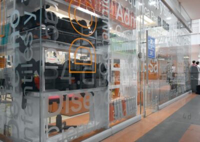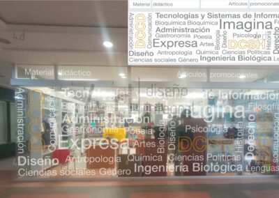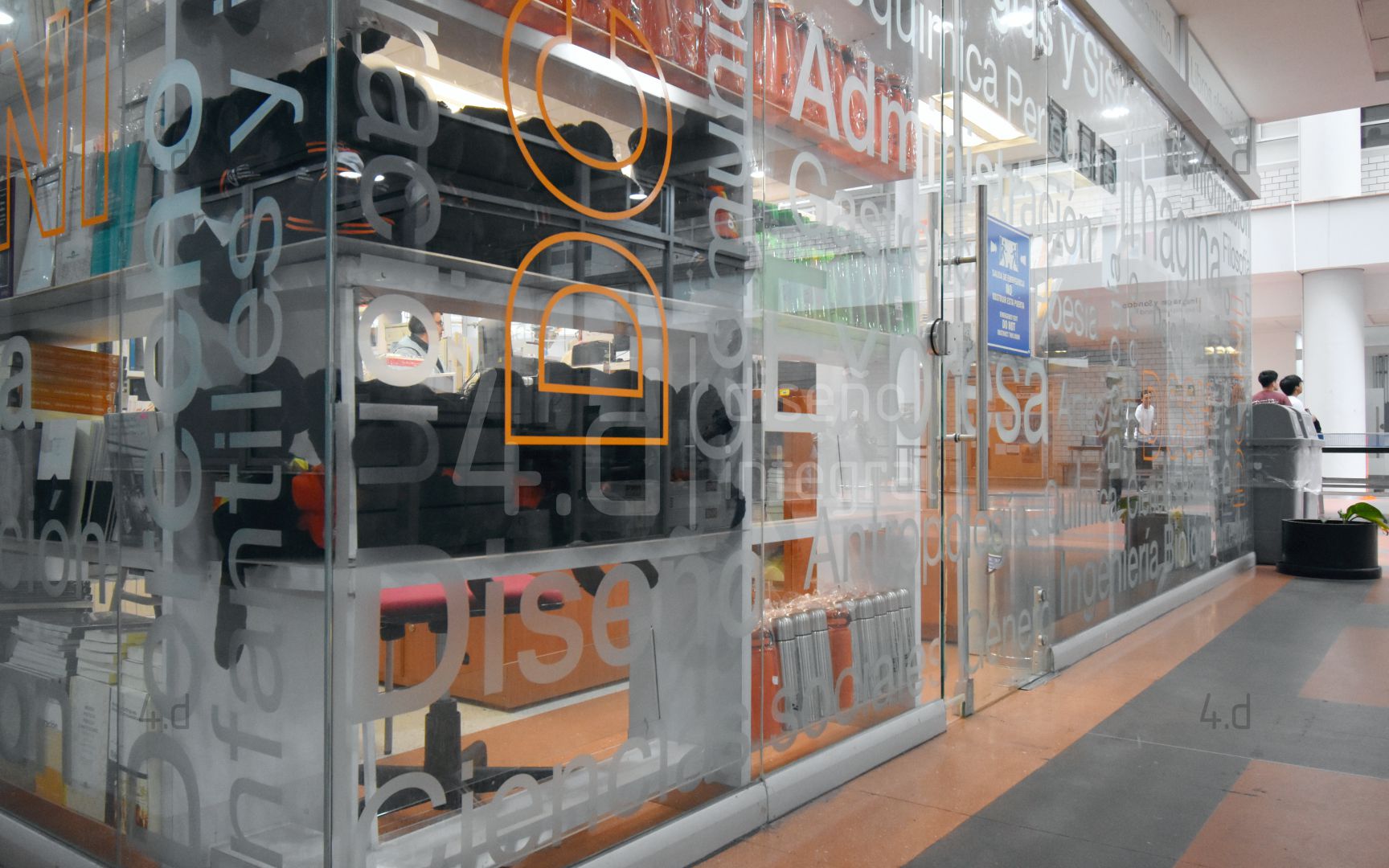 La disposición de los elementos tipográficos y gráficos se definió con el propósito de lograr una composición equilibrada y visualmente armónica que reflejara la esencia dinámica y activa del ámbito académico. El diseño fue producido en vinil adhesivo de alta durabilidad y resistencia, seleccionado por su capacidad para soportar las condiciones del entorno y conservar su apariencia a lo largo del tiempo. Para mantener la transparencia y luminosidad del espacio, se aplicaron dos tipos de vinil en los paneles de vidrio: uno traslúcido y otro en color naranja, utilizado para el contorno de las letras con los nombres de los departamentos de la Unidad.