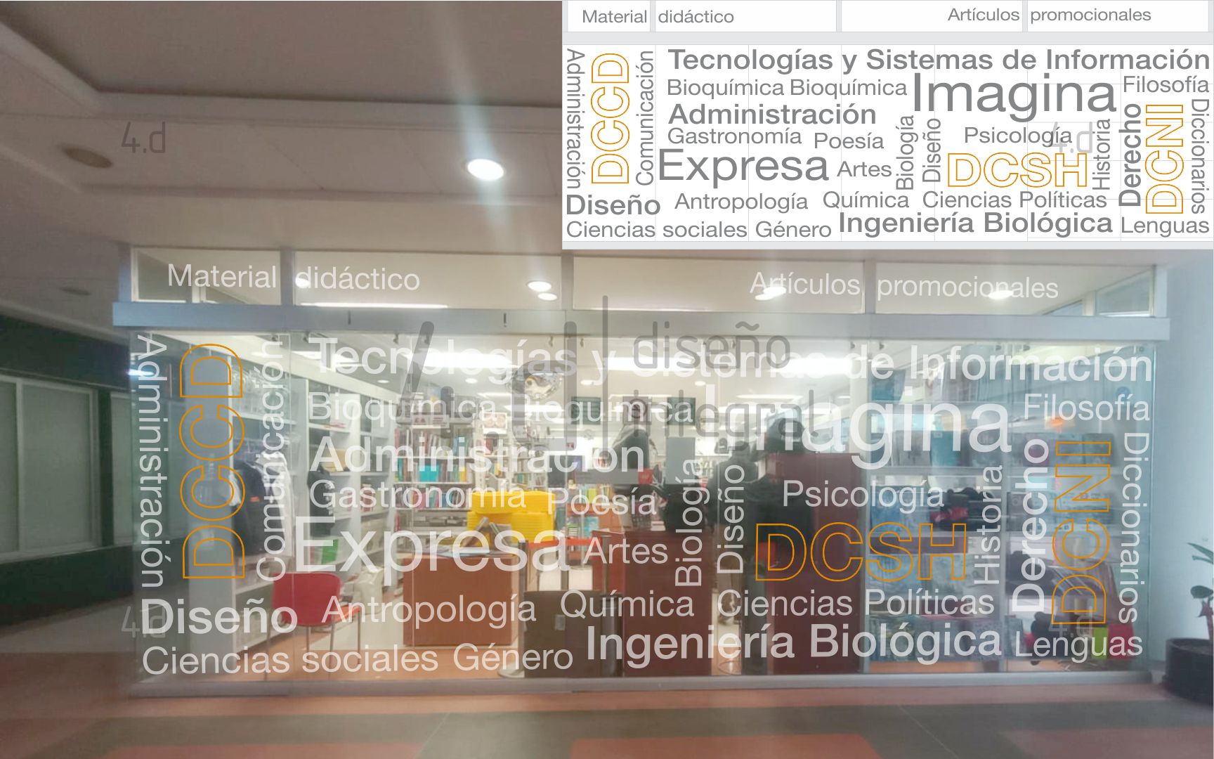El diseño integró una composición tipográfica construida a partir de palabras afines con la oferta editorial de la universidad, como los géneros literarios y temáticas relacionadas con las licenciaturas y divisiones académicas. Esta información se le solicitó al encargado de la librería con el propósito de crear un diseño vinculado directamente con la identidad y la actividad universitaria. Asimismo, se integró una imagen compuesta por el perfil de un rostro y una pila de libros, trazada con una sola línea para simbolizar la construcción del conocimiento a través de la lectura y el concepto de aprendizaje continuo.