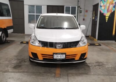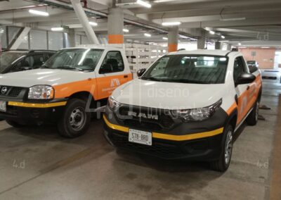 Para la rotulación se utilizó vinil adhesivo resistente a los rayos UV, humedad y variaciones de temperatura, garantizando una vida útil prolongada y la conservación del color frente a la exposición constante al exterior. Los colores principales empleados fueron naranja y blanco, aplicados en las zonas de mayor prominencia; en algunos automóviles se incorporó vinil negro para lograr una continuidad visual entre los distintos modelos.