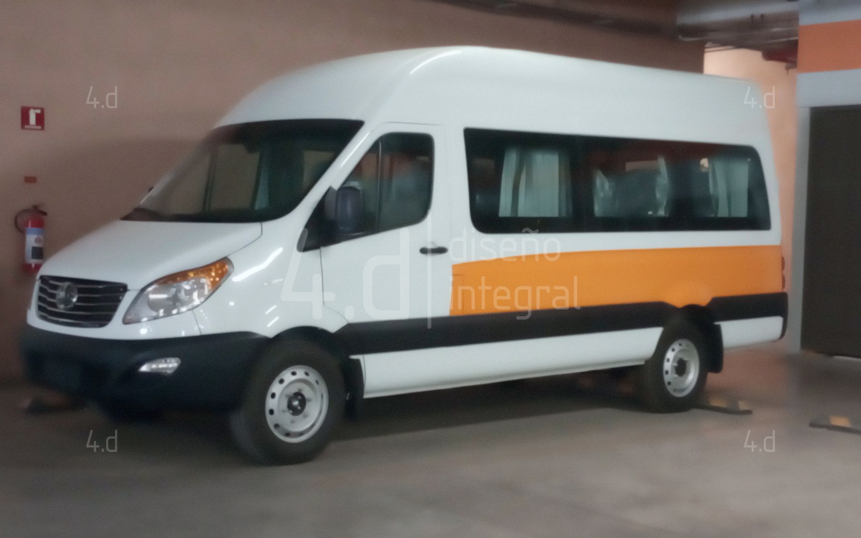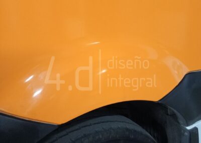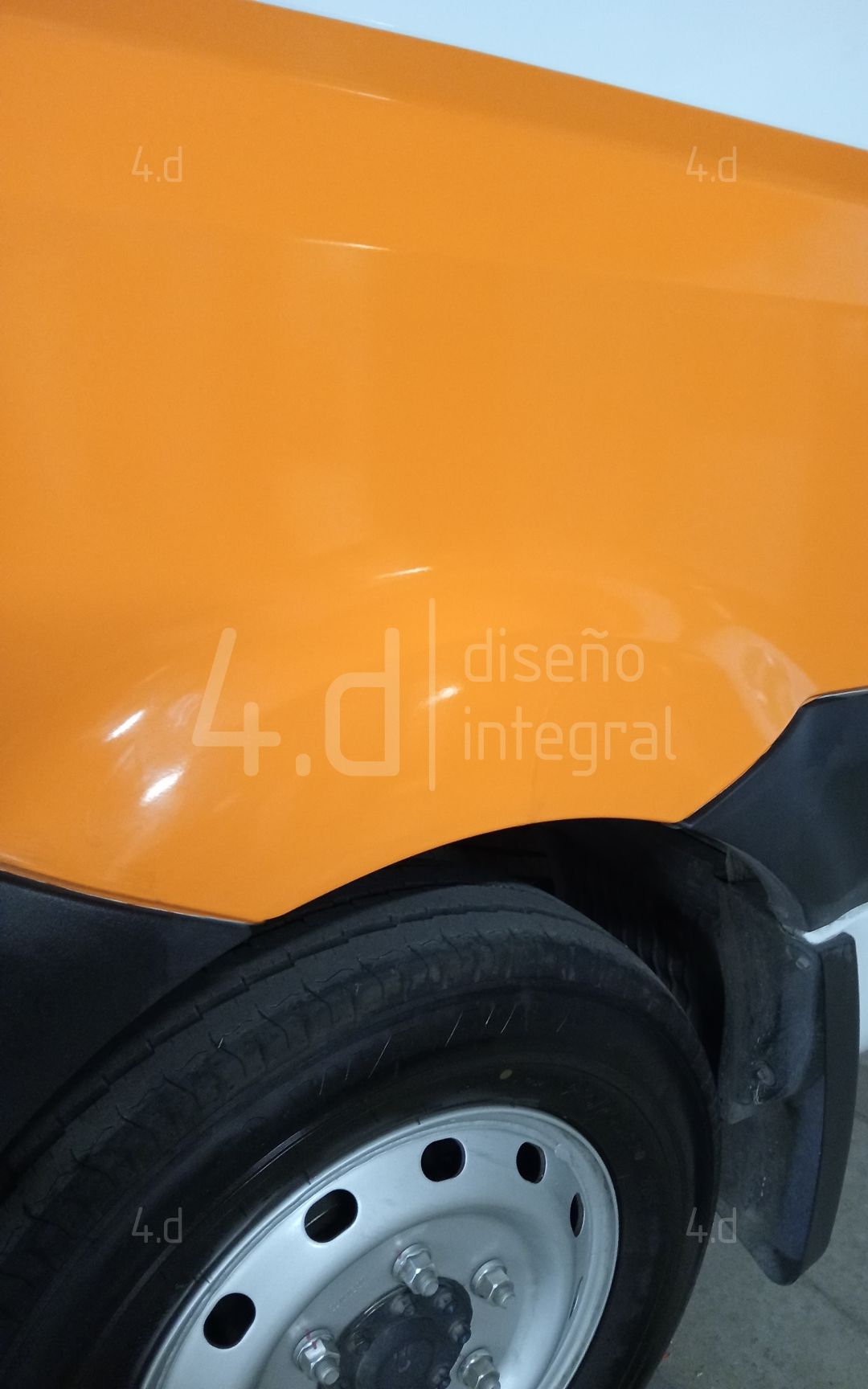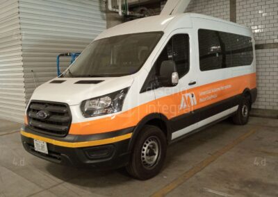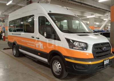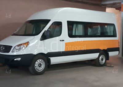 Una vez seleccionada la propuesta final, se desarrollaron renders personalizados para cada modelo, teniendo en cuenta sus dimensiones, curvaturas y proporciones, con el objetivo de proyectar con precisión el resultado antes de la aplicación del vinil. La propuesta gráfica se basó en el uso del color institucional naranja, complementado con blanco para destacar la información esencial, y adaptado cuidadosamente a las proporciones y características de cada tipo de vehículo. Se priorizó la fácil identificación a distancia, cuidando la legibilidad y la integración armónica con la carrocería.